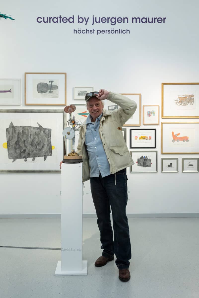 Die Auswahl der Werke aus Gugging führte schnell zur Vision, Maurers persönliche Wegbegleiter mit den Guggingern, ihren nationalen und internationalen Kolleg:innen sowie seiner Kunst gegenüberzustellen. So entstand ein spannender Dialog, ein künstlerisches Wechselspiel: curated by juergen maurer – höchst persönlich. So werden etwa Werke von Juergen Maurer gemeinsam mit den Fingermalereien des französischen Art Brut-Künstlers Michel Nedjar ausgestellt. Die Holzdrucke von Herbert Brunner, der für Juergen Maurer als Lehrer, väterlicher Freund und wichtiger Wegbegleiter fungierte, sind gemeinsam mit den Werken des Schweizer Künstlers François Burland zu sehen. Die Arbeiten des Kärntner Malers Peter Krawagna, die Maurer seit seiner Jugend begleiten, treffen auf die Welt des Gugginger Künstlers Helmut Hladisch. Beide Künstler, wie Maurer es treffend beschreibt, tanzen auf ihre eigene Weise mit der Wirklichkeit und harmonieren auf besondere Weise. In der galerie gugging wird es zudem eine Technikecke geben, denn unser Gastkurator ist seit jeher von der Fortbewegung auf motorisierten Zweirädern und dem damit verbundenen Freiheitsgefühl fasziniert. „Die Autonomie und das selbstbestimmte, beschleunigte Fortkommen machen mich seit jeher glücklich und beruhigen meinen Geist.“ erzählt der Mitbesitzer einer eigenen Autowerkstatt. Diese Liebe teilt Juergen Maurer auch mit einigen Gugginger Künstler:innen, darunter Laila Bachtiar, Günther Schützenhöfer, Leonard Fink und Jürgen Tauscher, deren Werke ebenfalls zu sehen sein werden. Auch David Staretz, ein weiterer jahrelanger Wegbegleiter, darf hier nicht fehlen. Staretz ist unserem Gastkurator nicht nur durch seine feinsinnige journalistische Arbeit für die Zeitschrift Autorevue ans Herz gewachsen, sondern auch durch seine kleinen, filigranen Maschinen – die sich der Schwerkraft nicht fügen und ebenfalls gezeigt werden neben weiteren Künstler:innen.