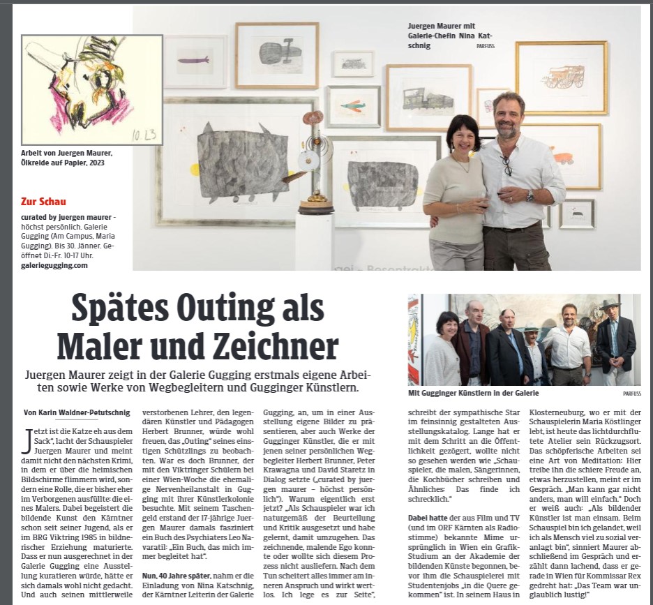 galerie gugging-Direktorin Nina Katschnig freut sich über die inspirierende Zusammenarbeit: „Der Titel der Ausstellung curated by juergen maurer – höchst persönlich ist keiner Eitelkeit geschuldet, sondern eine Offenbarung aus dem Innersten des Künstlers, der nicht nur ein Schauspieler durch und durch ist, sondern auch ein Meister der Dramaturgie. Juergen Maurer fängt als Kurator der Ausstellung seinen künstlerischen Werdegang in einer sehr persönlichen Inszenierung ein und zeigt dabei, wie sich sein Verständnis von bildender Kunst entwickelte und wer ihn auf diesem Weg begleitete & prägte.“ Der Künstler ist seit Jahren vertraut mit der Arbeit der Gugginger Künstler:innen und liebt vor allem ihren unverkopften Zugang zur Kunst.